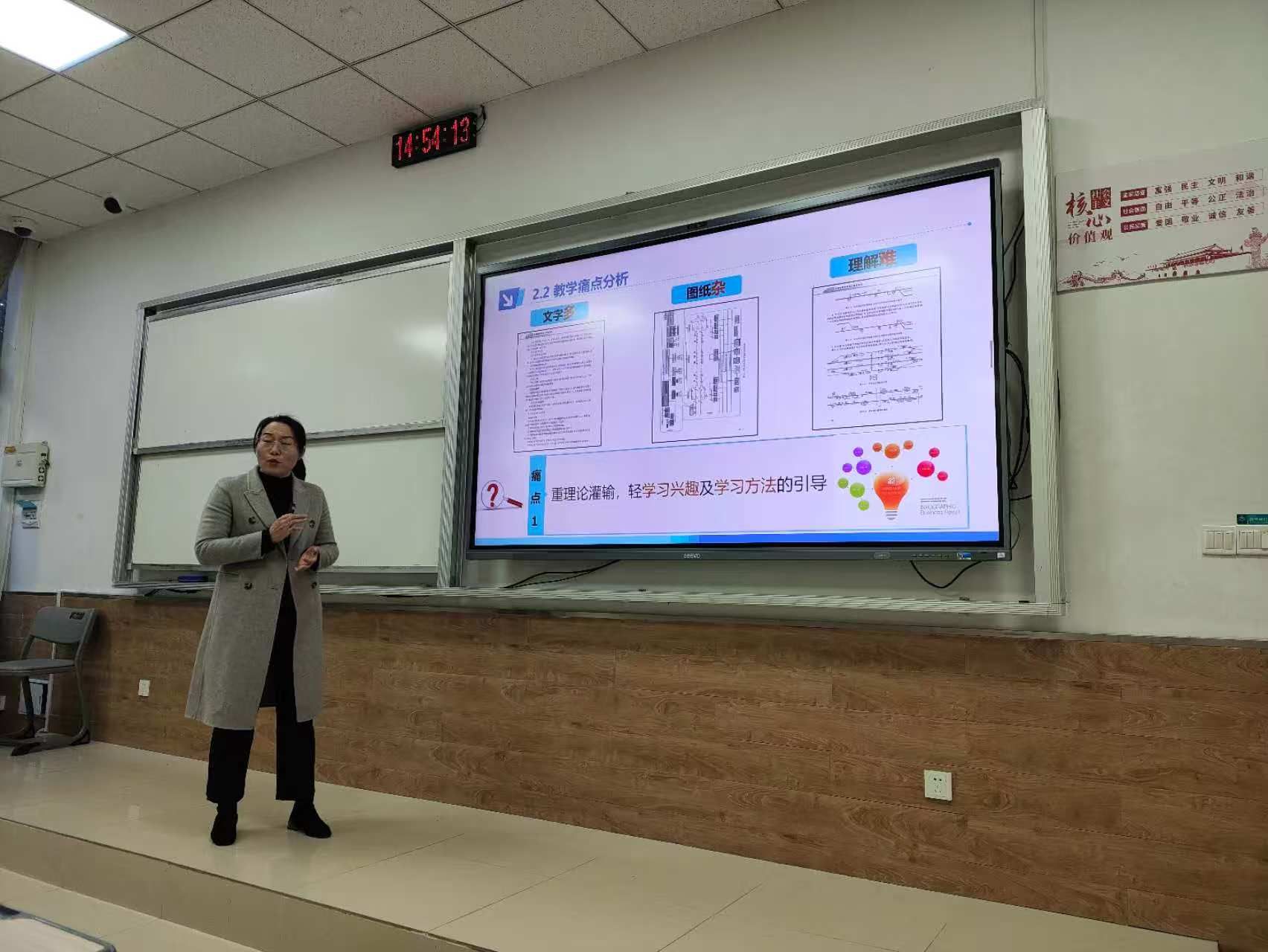 参赛教师共分4组,比赛现场气氛热烈,精彩纷呈。各参赛教师紧扣“教学创新”主题,以饱满的热情和扎实的功底,在15分钟的比赛时间内尽展风采。老师们通过对学生学情的科学剖析,在教学方法上或引入生动的案例将复杂抽象的理论形象化,或借助虚拟仿真等现代信息技术手段重构课堂等教学模式激发学生主动性与创造力。
