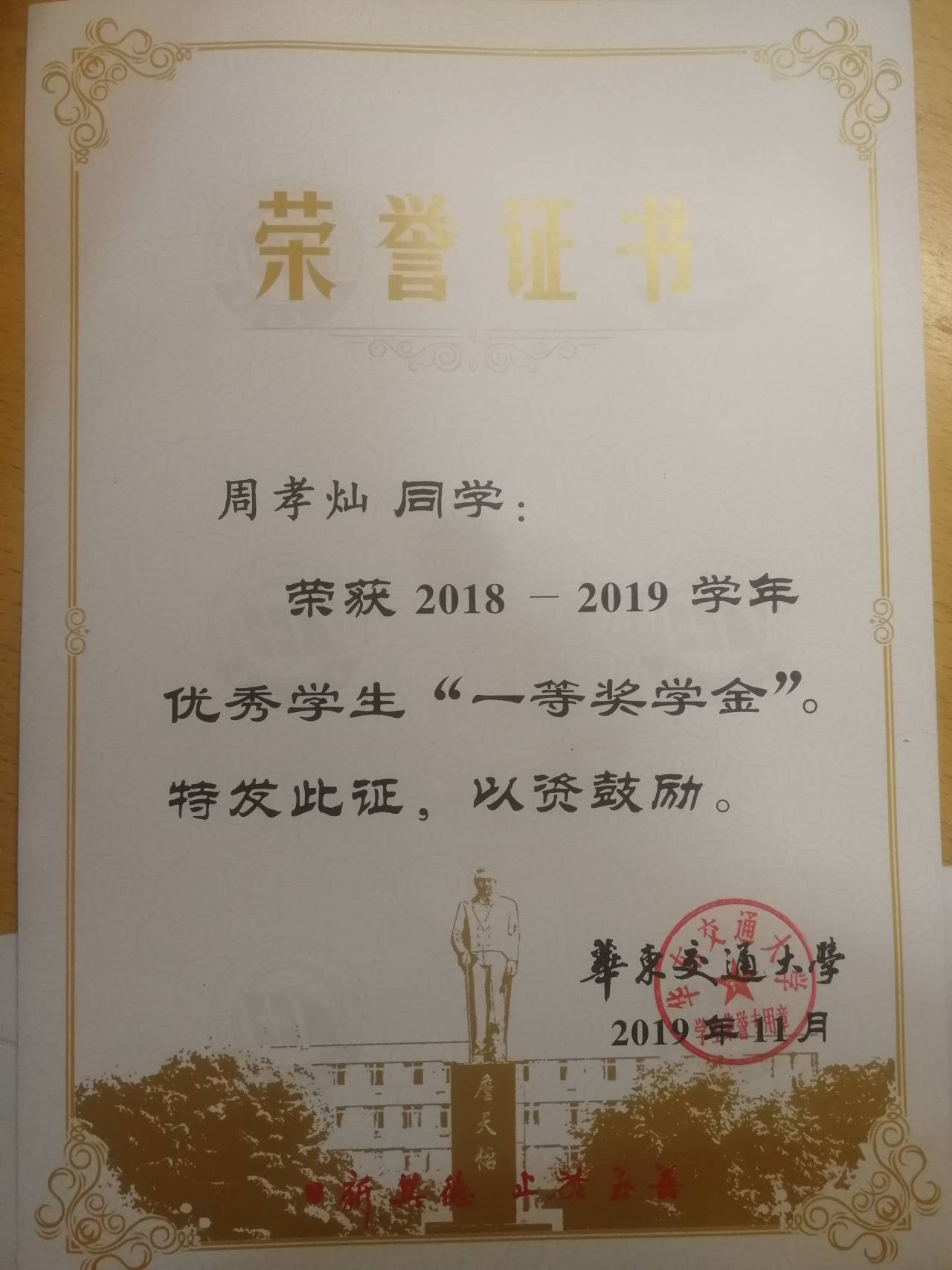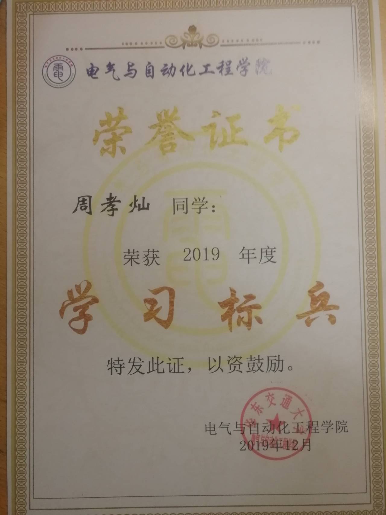 周孝灿,男,中共党员,williamhill中国工业自动化2017-2班学生,学习绩点3.79。连续三年综合测评专业排名第二,连续三年获得Williamhill威廉希尔一等奖学金。在2018、2019年,连续两年获得全国大学生英语竞赛三等奖,曾获“国家励志奖学金”、校“科技活动奖”、Williamhill威廉希尔第四届模拟电路设计大赛二等奖等奖项,在校期间曾获“三好学生”、“优秀学生干部”、电气学院学习标兵等荣誉称号。现已保研至中南大学。