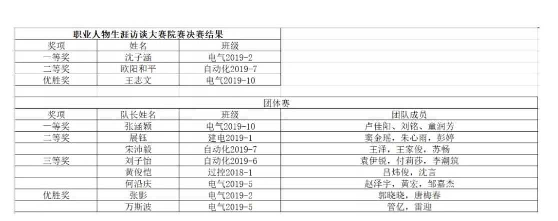经过激烈的角逐,本次职业生涯人物访谈大赛决赛圆满落幕。19级电气十班张涵颖团队获得团体赛一等奖,19级电气二班沈子涵获得个人赛一等奖。