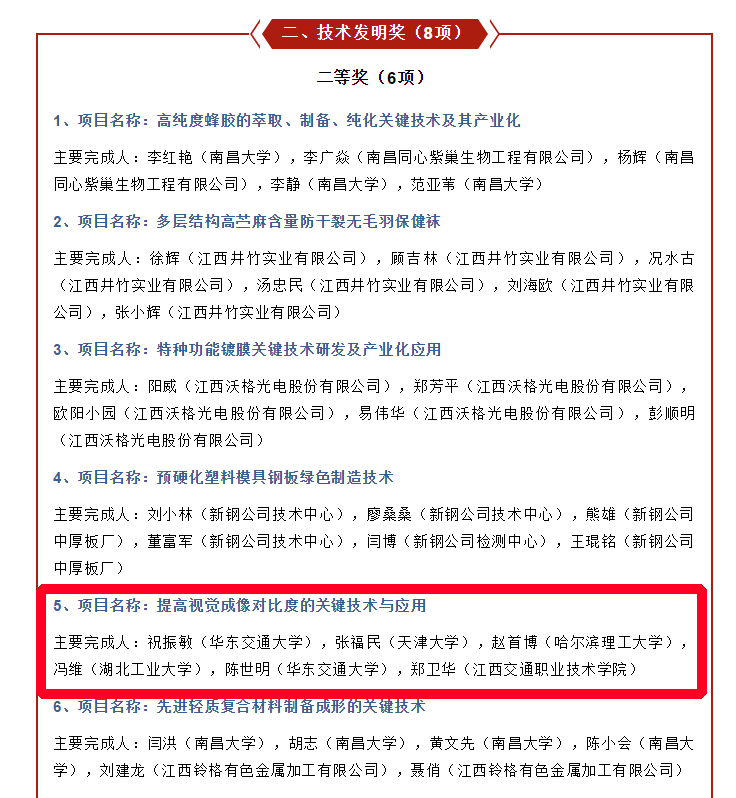 7月8日,江西省人民政府公布《江西省人民政府关于2019年度江西省科学技术奖励的决定》,对2019年度为全省科学技术进步、经济社会发展作出重要贡献的科技工作者和组织给予奖励。其中,以我院祝振敏博士、陈世明教授为主要完成人的“提高视觉成像对比度的关键技术与应用”项目荣获2019年度江西省技术发明二等奖。