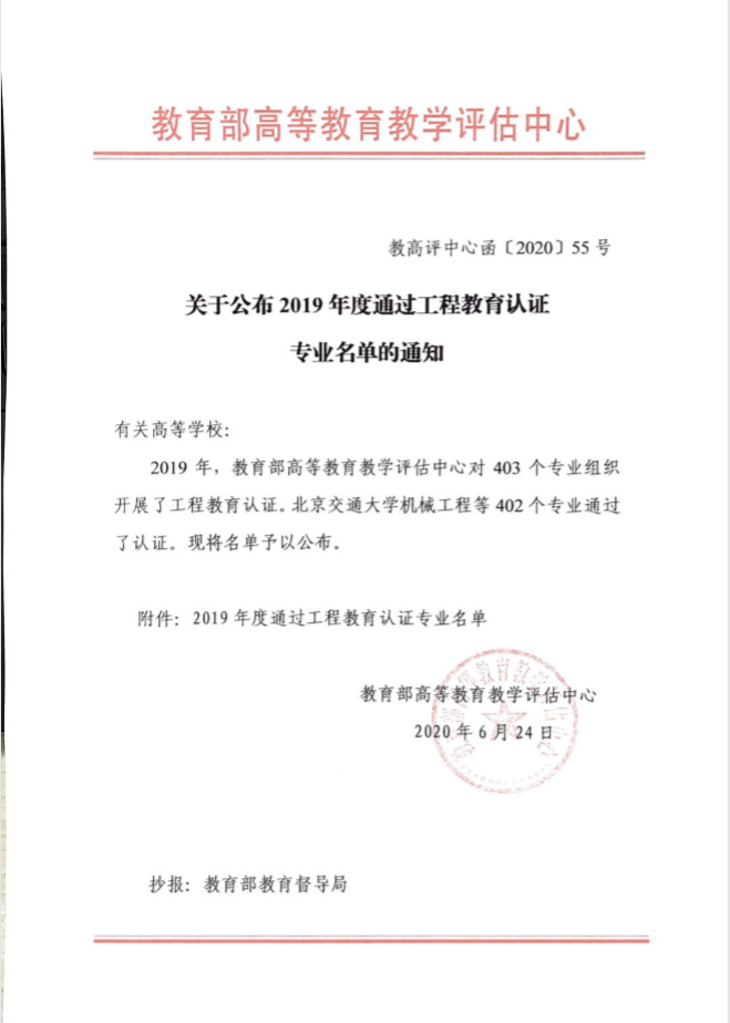 6月30日,教育部高等教育教学评估中心发布了《关于公布2019年度通过工程教育认证专业名单的通知》(教高评中心函〔2020〕55号),公布了2019年度全国工程教育专业认证的认证结论。我院电气工程及其自动化、自动化2个专业名列其中,认证有效期为6年(2020年1月至2025年12月)。