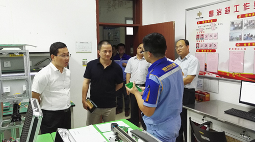 座谈会后,在刘宏泰的陪同下,陈世明一行参观了公司的创新工作室,陈世明对公司创新工作室的科研成果给予了高度赞誉,并希望我院教师能积极参与创新工作室的技术研发工作。