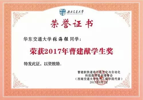 据了解,本次曹建猷学生奖学金评选在西南交大、北京交大、同济大学、中南大学等8所高校中进行,仅评选出6名本科生曹建猷学生奖学金获得者。而我院13级铁道电气化专业张海强就是其中一位。