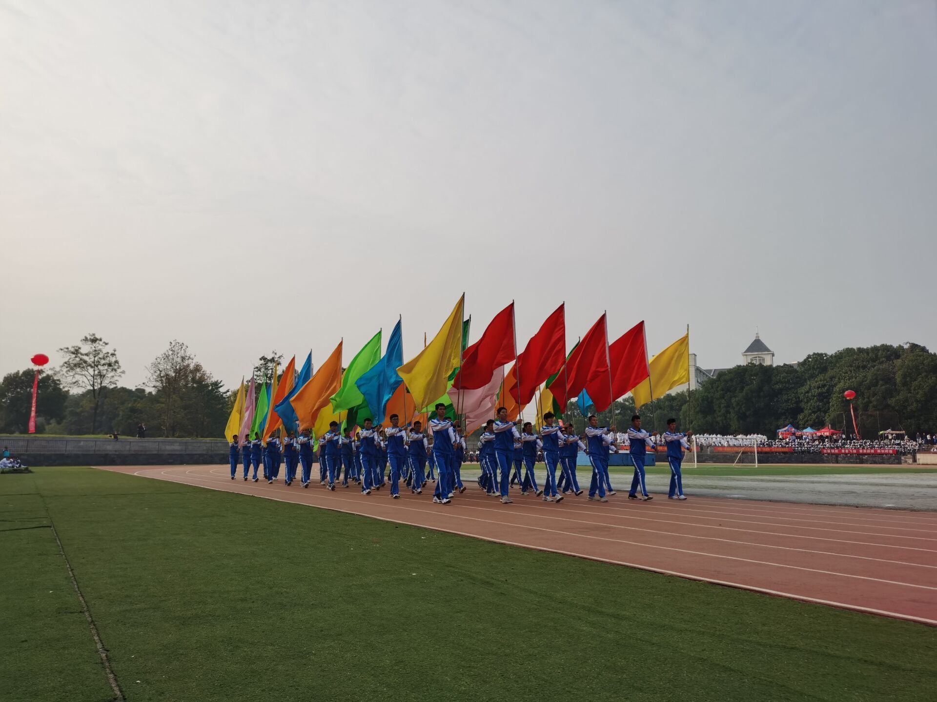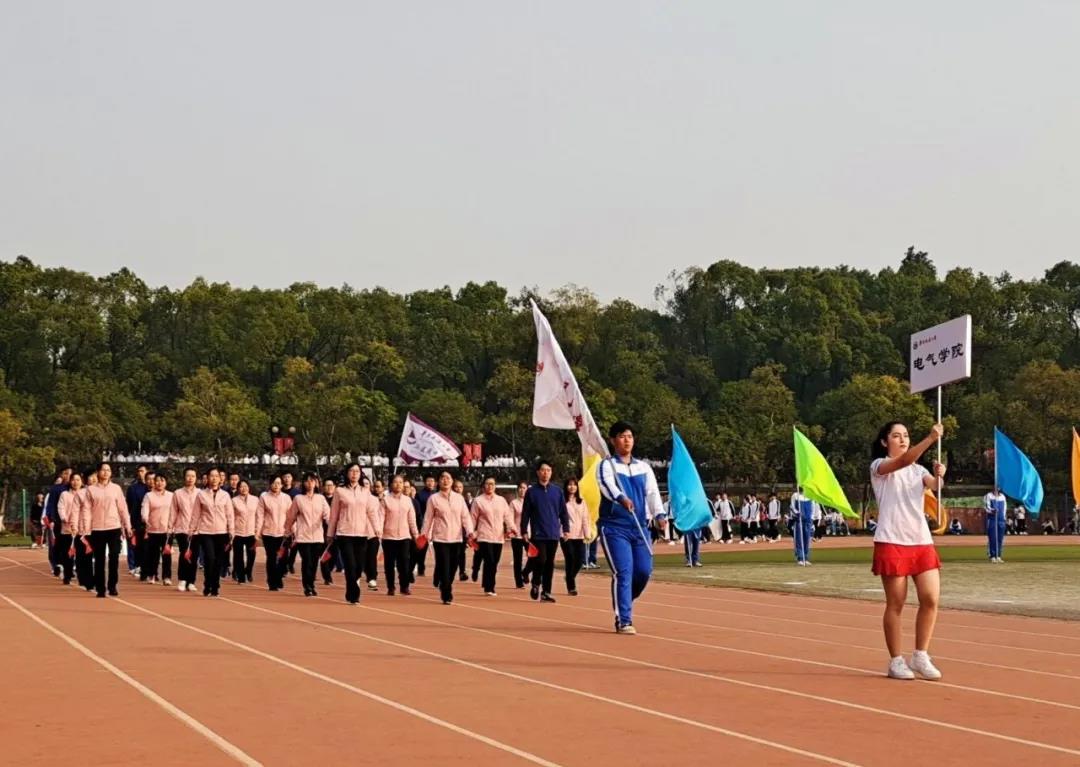 随后,电气学院彩旗队一马当先,健步入场,各学院方阵队代表紧随其后,有序接受主席台的检阅。