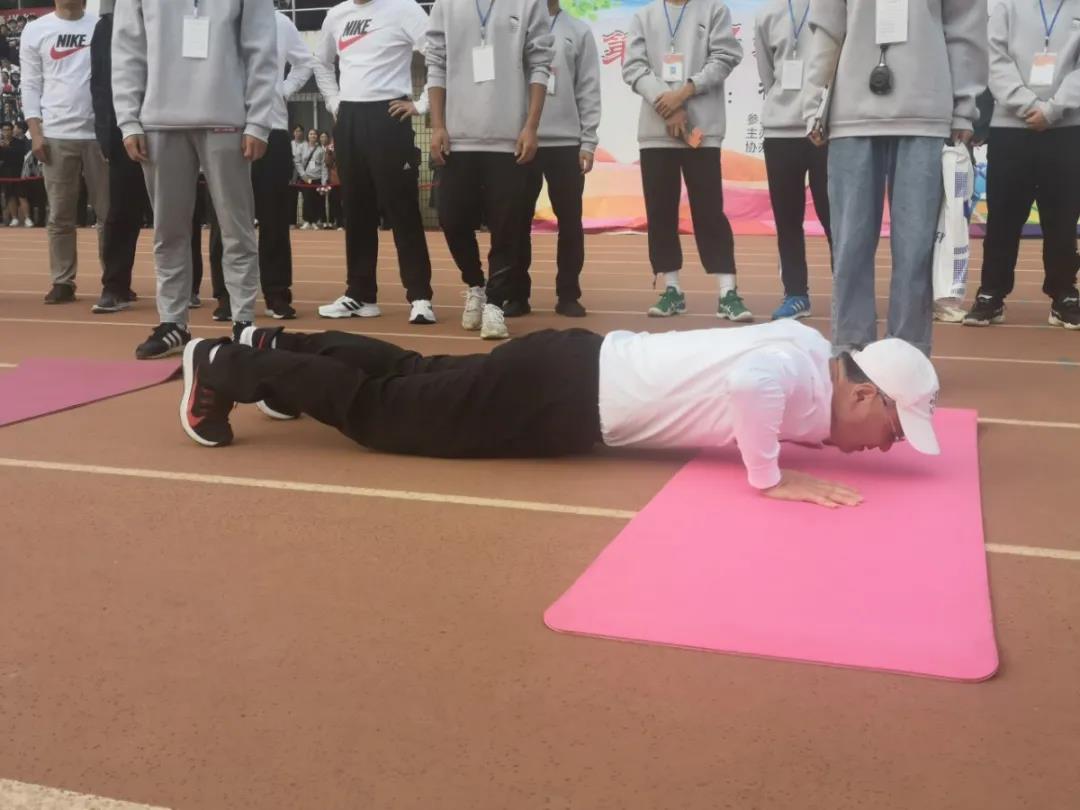在挑战校领导活动当中,万明书记首先做出表率,立擂展示三十余个俯卧撑。师生代表们皆跃跃欲试,比赛也如火如荼地进行着。