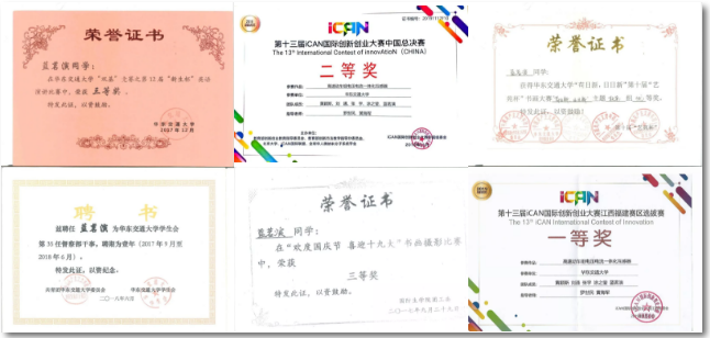 在校曾获2017-2018学年校一等奖学金,2017-2018学年校三好学生,2017-2018学年校英语演讲比赛三等奖,2017-2018学年校书画摄影大赛三等奖,2017-2018学年校艺苑杯书画大赛优等奖,2018-2019学年校一等奖学金,2018-2019学年校三好学生,2019-2020学年国家奖学金,2019-2020学年校二等奖学金,2019-2020学年校三好学生。