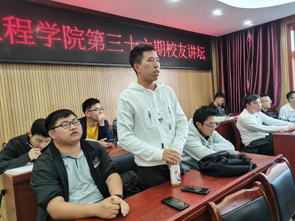 黄松涛结合自身工作以后的经历,给同学们提出几点建议,一是要牢牢掌握理论知识,为以后工作打下坚持基础;二是要广泛涉猎各方面的知识,增强自己的学识;三是要注重理论与实践相结合,注重自己动手能力的提高,这样才能游刃有余地胜任日后工作。
