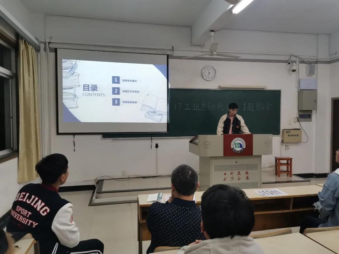 班会伊始,班长张世杰汇报了班级组成、获得荣誉、发展方向等基本情况。他用过去三年来班级所获得的一系列荣誉和奖项向徐雪松老师展示了工业自动化2017-1班的团结和进取。