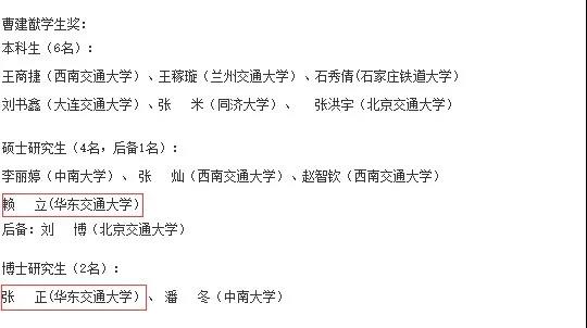 按照《曹建猷铁道牵引电气化与自动化科技教育基金会章程》规定,根据《关于开展2021年曹建猷教育奖和曹建猷学生奖评选工作的通知》要求,经个人申请、各高校审核、评委评审,我院硕士研究生赖立、博士研究生张正获2021年“曹建猷学生奖”。