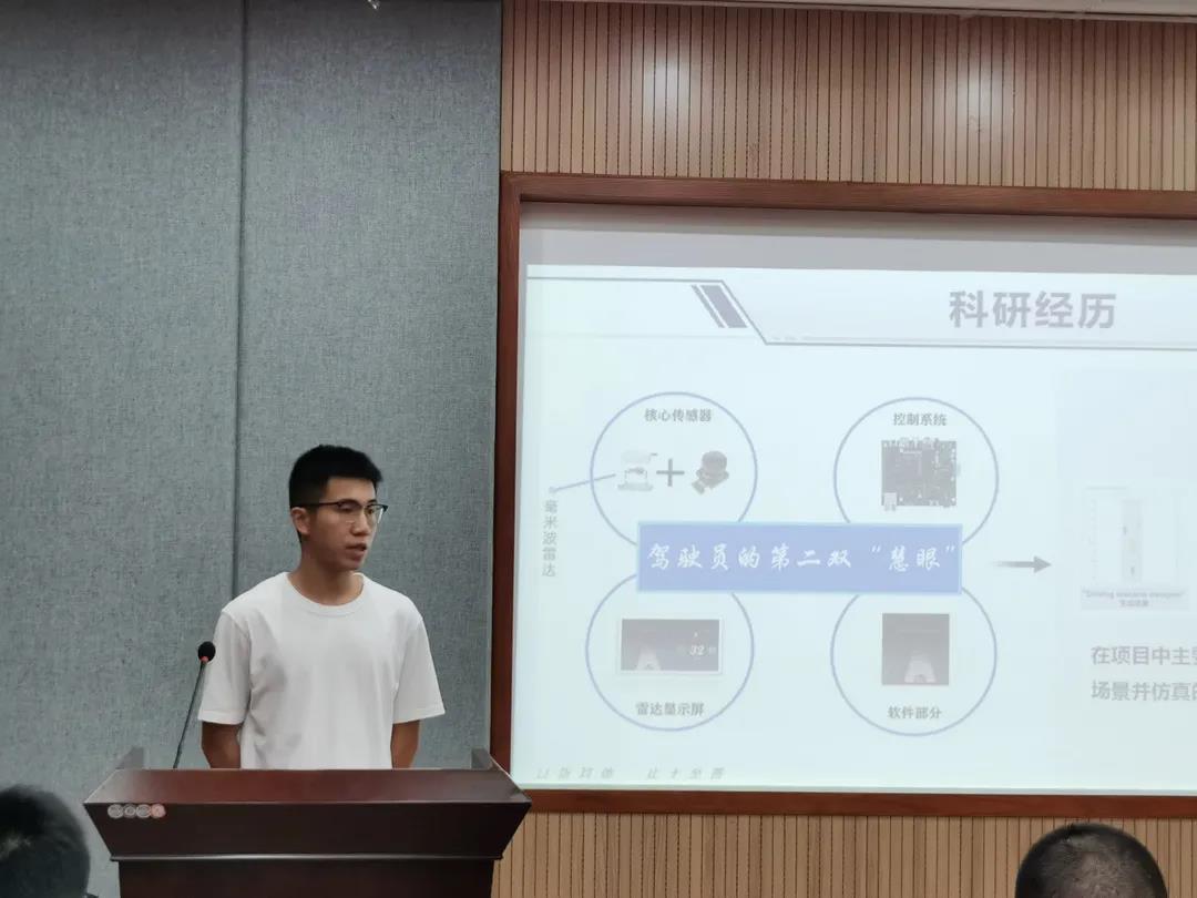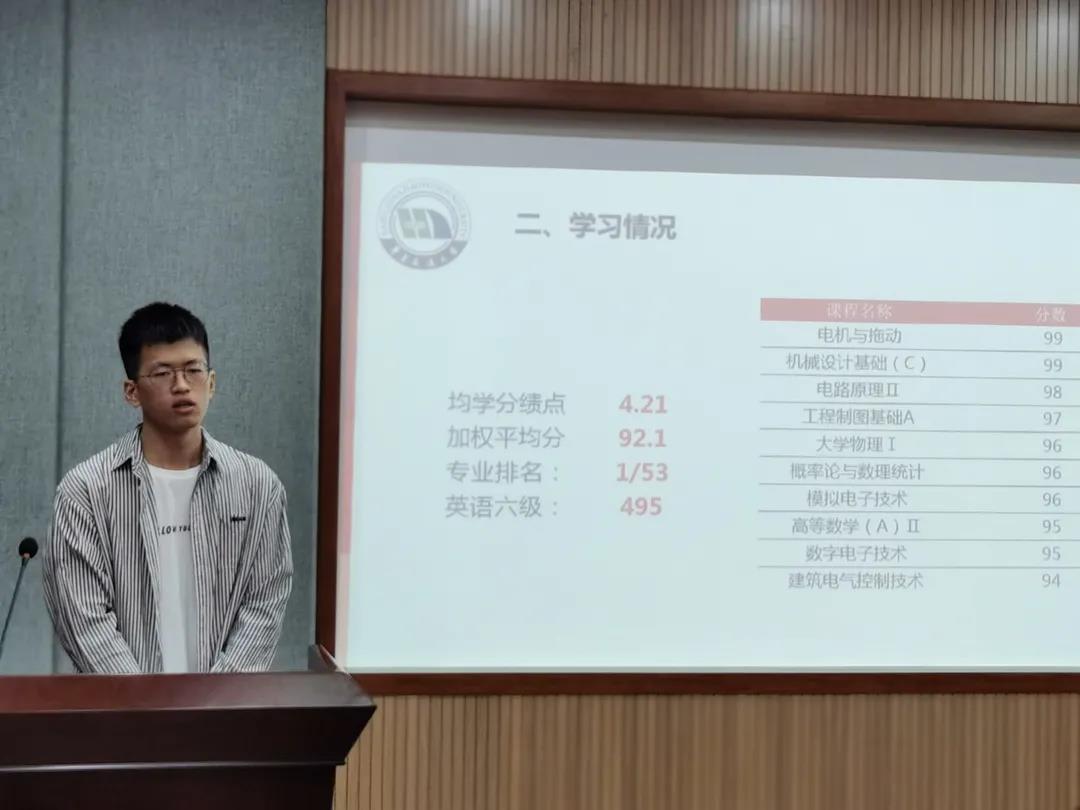 在主持人宣读完答辩要求和评审规则后,答辩评审会正式开始。短短五分钟的时间,参加答辩的同学通过PPT展示依次从学习成绩、学生工作、科创经历和综合素质等不同方面进行个人介绍和业绩陈述,并对未来的发展做出了规划和展望。