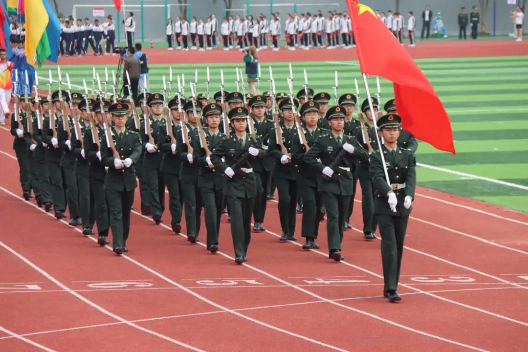 在全场的注目之下,国旗护卫队踏着铿锵整齐的步伐向观众走来,他们气宇轩昂,目光坚定,精神抖擞。