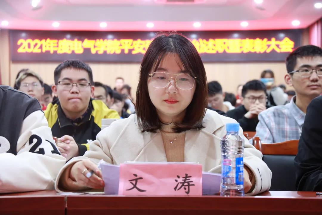 掌声过后,电气学院各班级代表做年度平安建设(综治)述职报告。本次大会,四个年级共计16个班的代表对本班的综治工作进行述职。