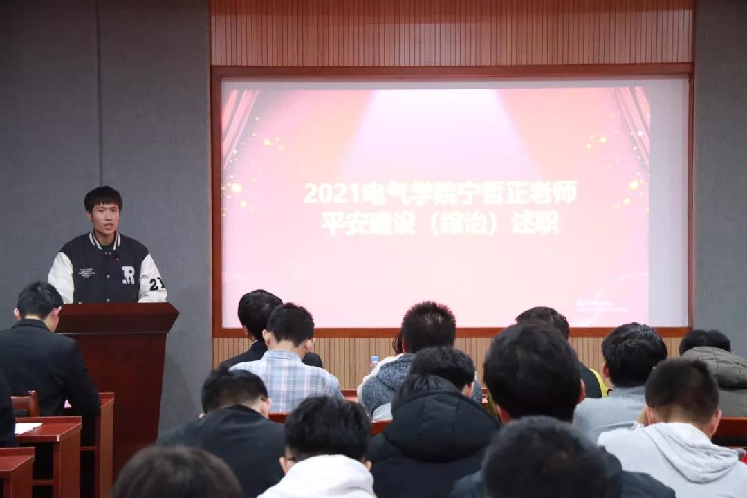 会议伊始,由电气学院安全文明创建中心主任方骏做部门年度平安建设(综治)述职。他表示,在过去的2021年里,电气学院十分重视校园平安建设及学院综合治理工作,并取得阶段性成功。各部门协调合作、防微杜渐,始终将安全问题放在首要位置,为平安校园的建设做出了重要贡献。同时,方骏也向学院和同学做出保证,安创中心在未来会更加关注校园安全问题,继续深化综治工作,成为电气学子生活的坚实后盾和保障。