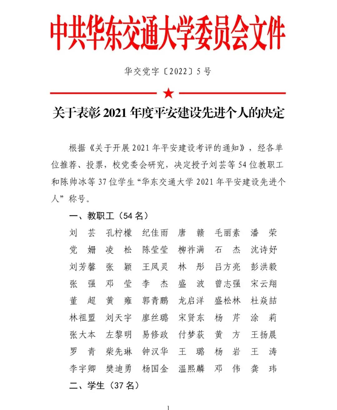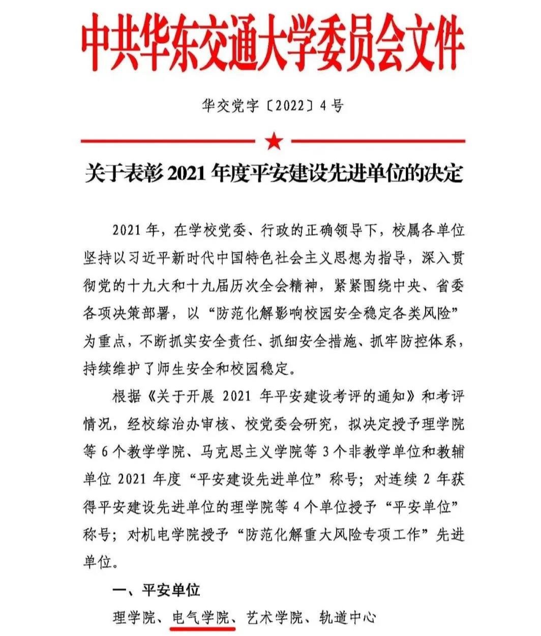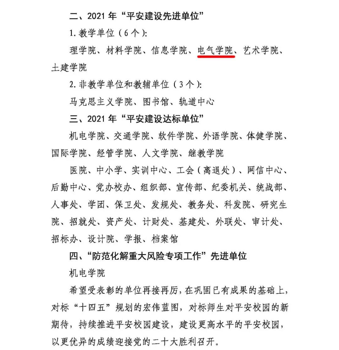 根据《关于开展2021年平安建设考评的通知》和考评情况,经校综治办审核、校党委会研究,决定授予我院“平安单位”及2021年“平安建设先进单位”。