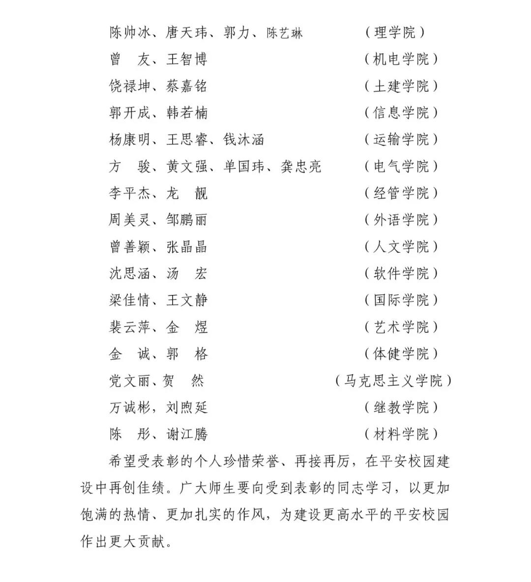 根据《关于开展2021年平安建设考评的通知》,经各单位推荐、投票,校党委会研究,决定授予我院石杰、沈诗妤、柴先琳、钟汉华4名教职工,方骏、黄文强、单国玮、龚忠亮4名学生“Williamhill威廉希尔 2021年平安建设先进个人”称号。