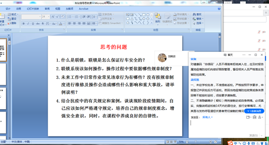 负责《车站信号自动控制》课程的老师在线上教学中,巧妙将思政元素融入课程,以图片、视频等形式对课程进行分析和讲解,通过学习联锁的内涵以及联锁系统如何保障行车安全,提高学生的安全管理意识,同时老师要求学生们要严格遵守规章制度、按章操作,引导学生树立安全意识,塑造制度观念。