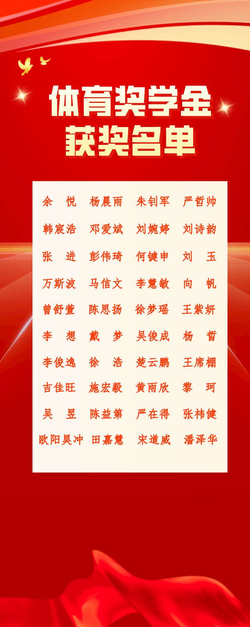 为表彰体育方面突出、为学院争光的优秀同学,我院特此进行体育奖学金的评定。奖学金评定者需具有良好的道德品质和行为习惯,积极参与学校和学院组织的各项体育活动,为学院的体育事业做出贡献,并在本学年校运会期间,个人单项赛事位列前八或所在队伍在团体赛事中位列前三,且学习刻苦、成绩优异,无挂科、重修。现将我院"体育奖学金"获得者名单进行公布。