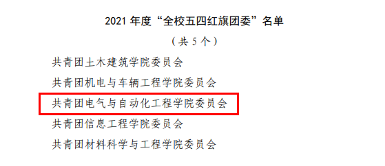 经各学院推荐,校团委综合评定,我院团委荣获“全校五四红旗团委”称号;我院工业自动化2019级1班团支部等7个团支部荣获“全校五四红旗团支部”称号;我院刘铭涛等28名团员荣获“全校优秀共青团员”称号;我院文涛老师等5人荣获“全校优秀共青团干部”称号。