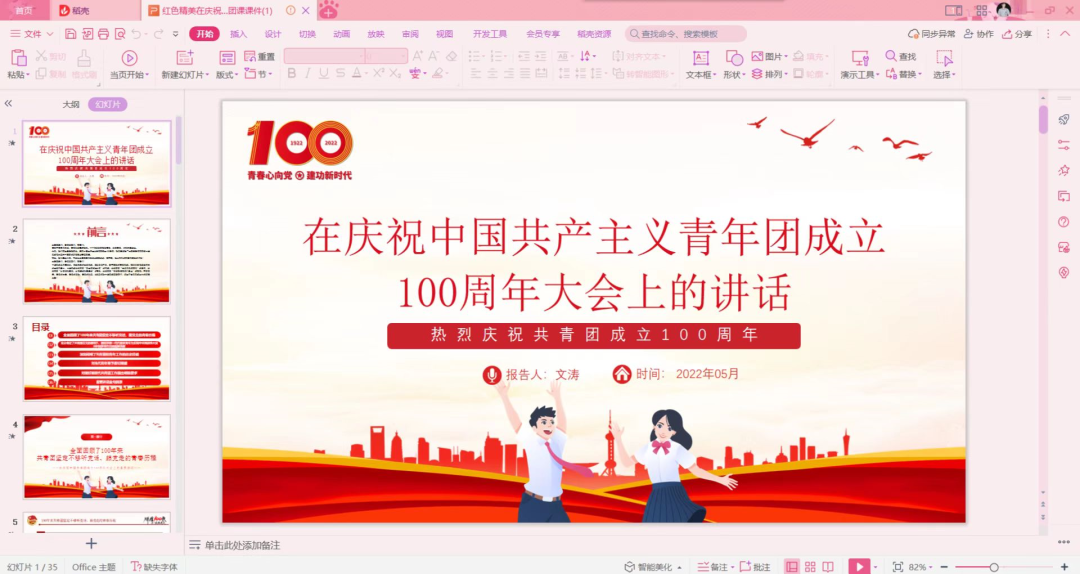 会议尹始,文涛老师给全体团员青年带来一堂“深入学习贯彻习近平总书记在庆祝中国共产主义青年团成立100周年大会上的重要讲话精神”专题团课。她从“全面回顾100年来共青团坚定不移听党话、跟党走的青春历程”、“充分肯定了共青团在党的领导下,团结带领一代代团员青年为实现中华民族伟大复兴中国梦所作出的重要贡献”、“深刻阐明了共青团和青年工作的历史经验”、“对当代青年寄予殷切期望” 、“对做好新时代共青团工作提出的明确要求”5个方面进行了阐述。中华民族始终有着“自古英雄出少年”的传统,青年始终是推动中华民族勇毅前行、屹立于世界民族之林的磅礴力量。广大团员青年要树立远大理想、热爱伟大祖国、担当时代责任、勇于砥砺奋斗和练就过硬本领,以实现中华民族伟大复兴为己任,不辜负党的期望、人民期待。