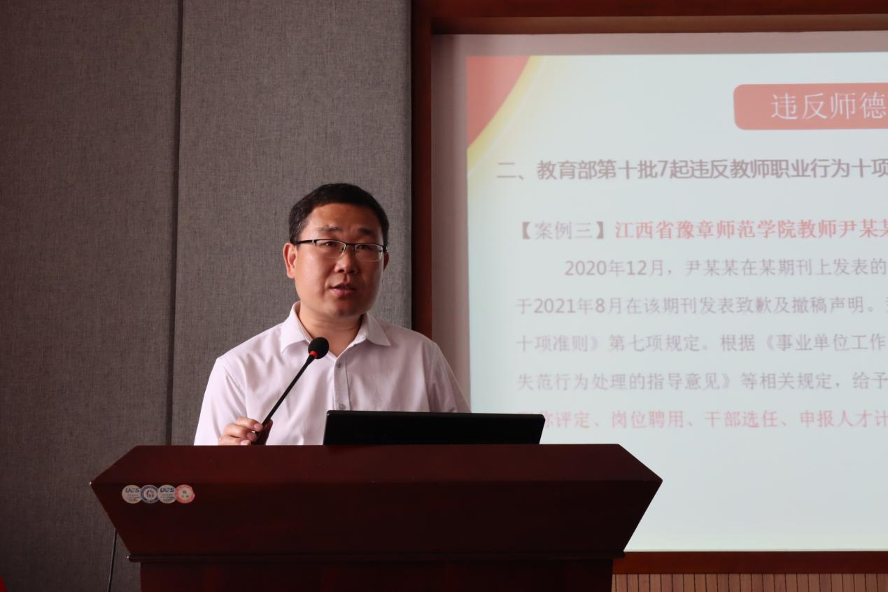 为切实加强师德师风建设,强化日常教育督导,进一步增强广大教职工为党育人、为国育才的初心使命,充分发挥典型案例在师德师风建设中的警示作用,5月11日下午,我院在教10栋403会议室召开“以案为鉴”师德师风专题大会。大会由院党委书记赵敏主持,学院全体教职工参加会议。