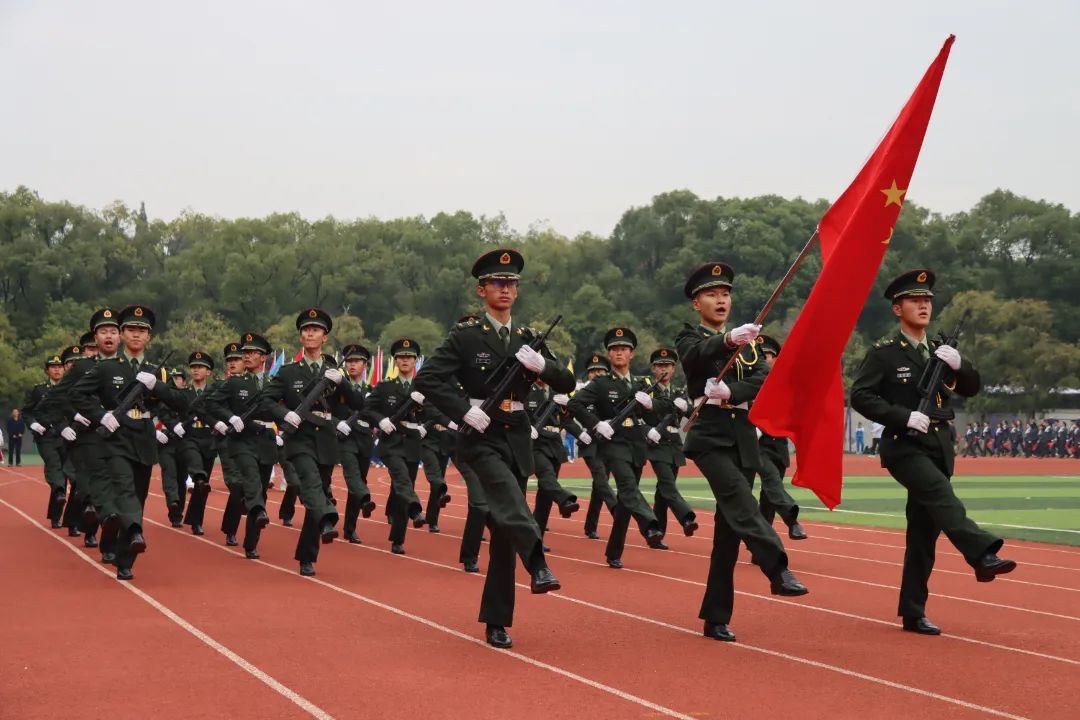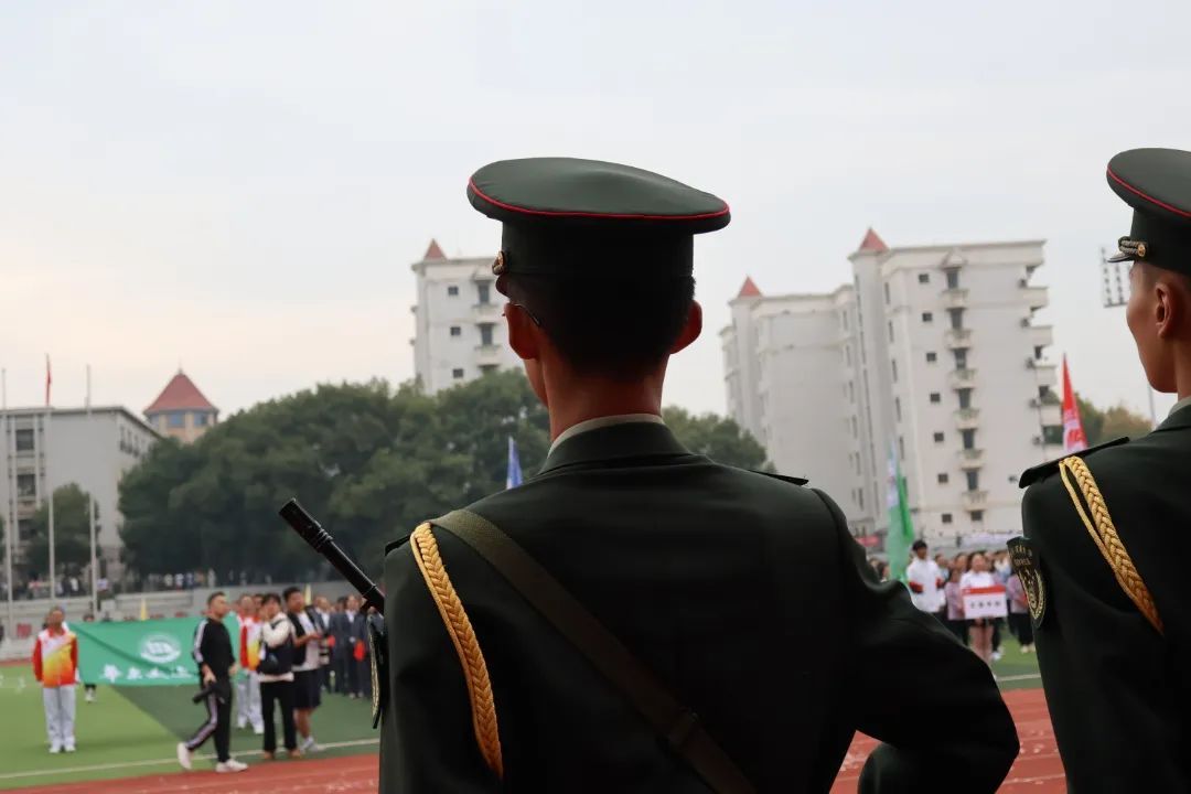 在严谨有序的队列下,国旗护卫队迈着铿锵有力的步伐,缓缓向主席台走来,他们神情端庄、英姿飒爽,象征着祖国的荣誉与尊严,展现了青年大学生的朝气蓬勃。
