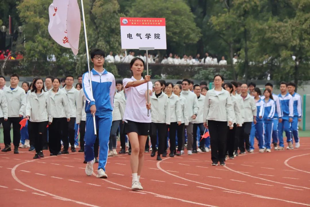 随之而来的是各个学院的仪仗队。电气学院方阵神采飞扬,昂首阔步走向主席台,如同舞台上的艺术家,矫健有力的步调昭示了火焰般的斗志。他们昂首挺胸,勇往直前。