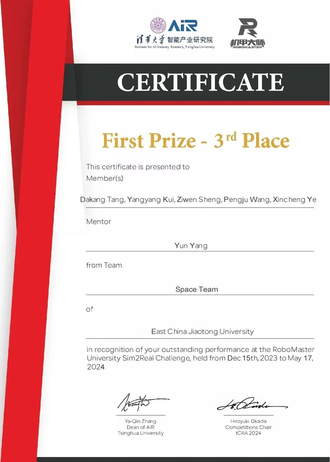 面对一众来自顶尖学府的队伍,以及开源资料少、比赛情况复杂多变的情况下,“航天战队”队员们抱着敢闯敢拼的心态直面困难,在初赛中以第五名的优异成绩成功入围复赛。复赛中,官方会提供机器人与场地,每周给各支队伍一次调试机会并反馈现场视频与数据包,这个过程持续了两个月看似很长但算来仅仅只有九次调试机会,队员们熬夜苦战,戴月披星,逐帧观看视频、逐字节分析数据,以使得算法达到完美。最终迎来5月6号的正式比赛,比赛过程中“航天战队”的机器人稳定运行,完成了所有任务点以及附加分,以36分(总分42)的成绩排名第三,荣获一等奖!