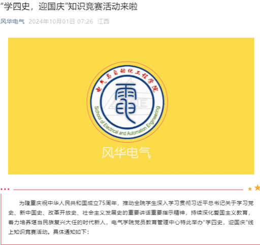为庆祝中华人民共和国成立75周年,推动全院学生深入学习贯彻习近平总书记关于学习党史、新中国史、改革开放史、社会主义发展史的重要讲话重要指示精神,持续深化爱国主义教育,着力培养堪当民族复兴大任的时代新人,电气学院在国庆期间举办“学四史,迎国庆”线上知识竞赛活动,引导广大学生厚植家国情怀,砥砺报国之志。