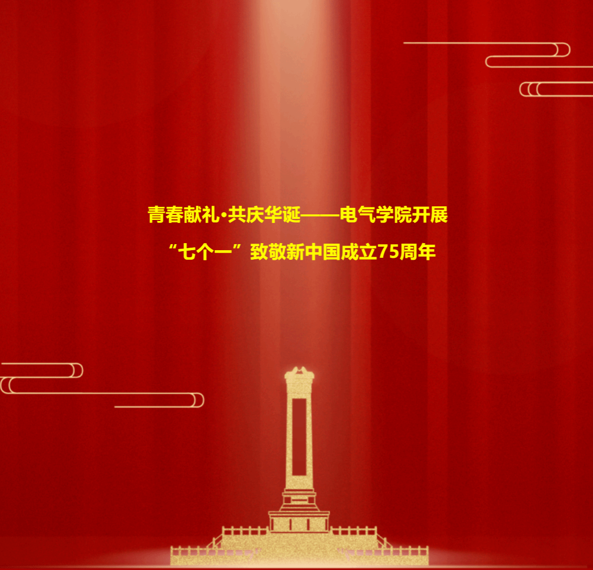 在金秋的微风中,丹桂的香气里,我们迎来了中华人民共和国成立75周年的辉煌时刻。电气学院按照学工处统一安排部署,师生以满腔的热情开展“一次升旗观礼”“一段青言青语”“一张国旗合影”“一趟云游宣讲”“一台文艺汇演”“一场团日活动”“一次党史竞赛”等“七个一”思政教育活动,用丰富多彩的爱国主义教育活动,让青年学子在节日的气氛中厚植家国情怀、彰显时代担当,凝聚起强国建设、民族复兴的强大精神力量,用实际行动为祖国母亲献上真挚的祝福。