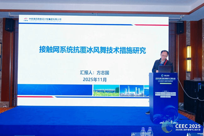 中铁第四勘察设计院集团有限公司方志国副总工程师作了题为《接触网系统抗覆冰风舞技术措施研究》的报告,指出“覆冰导线的低频大振幅舞动是威胁高速铁路弓网受流安全的关键致灾因素。基于有限元仿真与气动参数分析,揭示了风速、风攻角、跨距及张力配置对舞动响应的作用规律,提出通过优化承力索与接触线的张力匹配、适度降低结构高度与吊弦密度等系统参数以抑制舞动响应。进一步设计了多类型扰流防舞器的差异化布置方案,并在汉宜铁路等区段开展现场验证,为实现接触网系统在复杂气象条件下的抗风舞设计与运维提供了理论依据与技术路径。