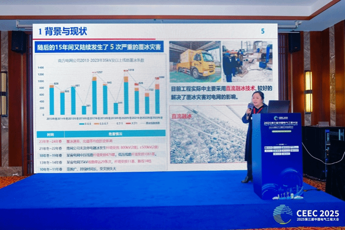 国网四川省电力公司电力科学研究院刘益岑高级工程师作了题为《四川电网覆冰监测及融除冰技术》的报告,指出“四川高海拔山区微地形微气候条件导致输电线路覆冰监测困难,传统观冰方式存在精度低、响应慢等问题。基于拉力传感器的覆冰在线监测系统,通过建立覆冰拉力变化率与等值覆冰厚度的无量纲换算模型,实现了覆冰厚度误差小于2毫米的高精度监测,并依托北斗短报文通信实现无信号区覆盖。该技术结合直流融冰装置与多型除冰机器人,形成“监测-预警-处置”闭环管控体系,为复杂地形下电网覆冰灾害的精准感知与高效处置提供了系统性技术支撑。