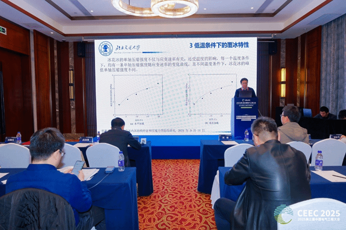 北京交通大学电气工程学院孙继星教授作了题为《高温差覆冰力学特征及其对接触网机械性能的影响》的报告,指出“接触网覆冰附着力与破坏模式受温度变化与覆冰类型显著影响,其力学特性直接关系到除冰效率与接触网结构安全。通过分析静态与动态覆冰的附着力差异,揭示了温度临界点对冰层结合强度的非线性影响规律,并结合不同加载速率下的冰体压缩试验,明确了覆冰厚度与除冰率的负相关关系。该研究为接触网在高温差环境下的除冰时机选择、除冰装置优化及接触线动态响应评估提供了理论依据,对提升极端气候条件下接触网机械安全性与除冰操作有效性具有重要指导意义。