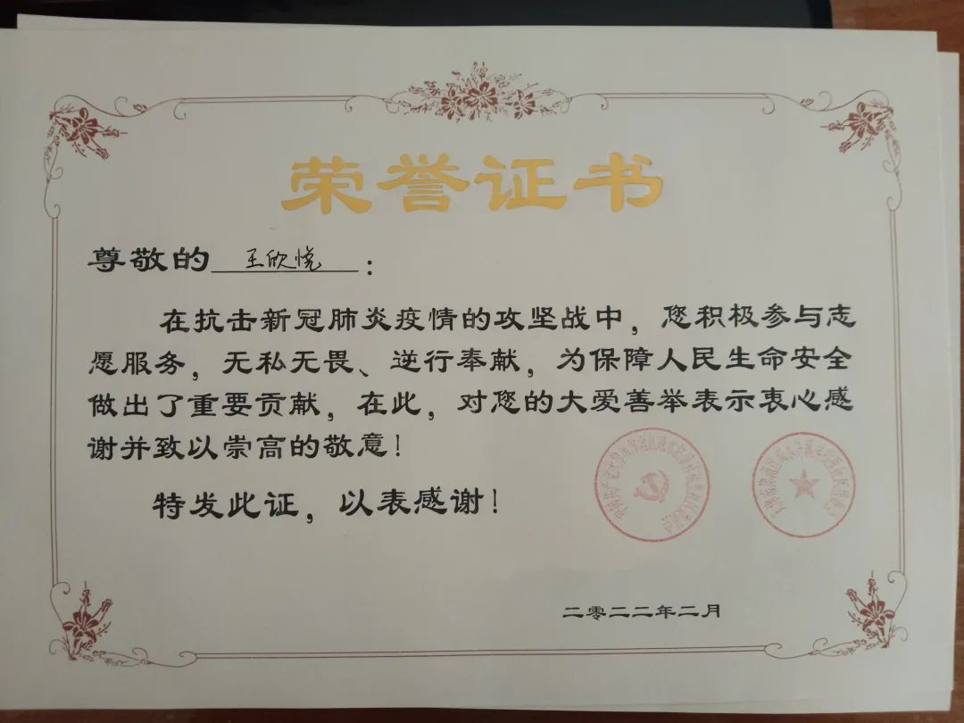 在防疫工作期间,王欣悦协助医务人员核对信息,对医务人员进行消杀工作,在封控时为居民搬运生活用品,确保了防疫工作的顺利进行。即便工作很繁重,天气很寒冷,王欣悦也没有懈怠,认真核查每一个人的信息,一趟又一趟地搬运着物资。她的辛勤付出得到了社区以及居民的大力肯定。她用行动展现了新时代大学生的精神风貌,也诠释了什么是华交“铁人”,为华交学子树立了良好的榜样。