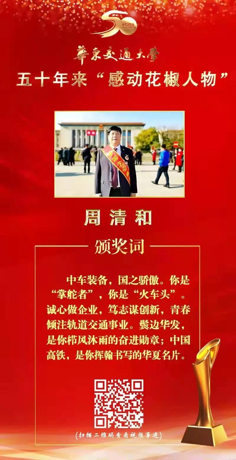 周清和,男,1983级机械制造工艺与设备专业校友,全国人大代表,中车株洲电力机车有限公司党委书记、董事长。34年职业生涯,他把青春和理想都奉献给了轨道交通事业。