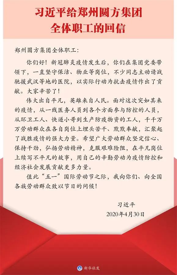在五一国际劳动节来临之际,习近平总书记给郑州圆方集团全体员工的一封回信,对疫情期间劳动群众“坚守“、“奉献”的精神做出肯定,也对广大劳动人民做出了更高的勉励与期许。