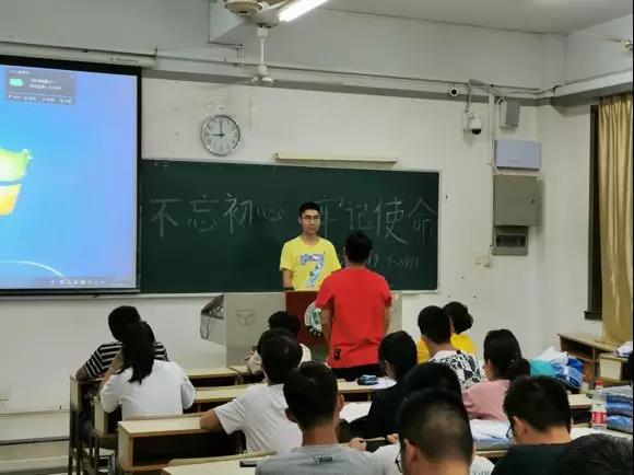 “年满十八岁的中国工人、农民、军人、知识分子和其他社会阶层的先进分子,承认党的纲领和章程……可以申请加入中国共产党。”这是19级新生带班学生党员吴世晟正在为新生普及党的基础知识,端正新生的入党动机,为新生向党组织积极靠拢提供正确的方向。