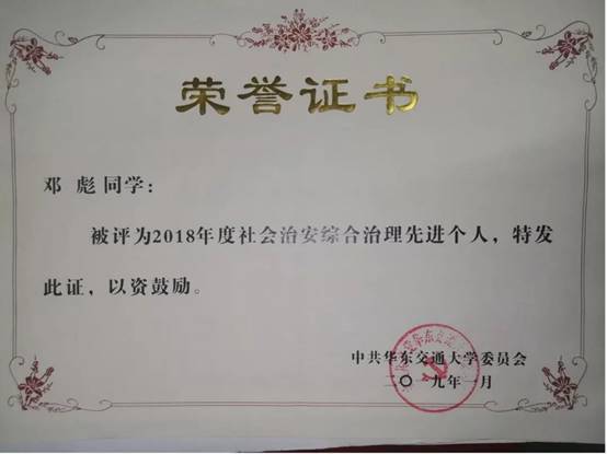 自入校以来,他没有丝毫放松对自己的要求,他秉承着:“做事先做人,万事勤为先”的理想信念,并在思想、生活、学习和工作上更加严格要求自己。在导师的关怀和自身不懈努力下,取得了优异的成绩,为广大学生树立了一个良好的模范榜样,起到了一名党员的先锋模范作用。
