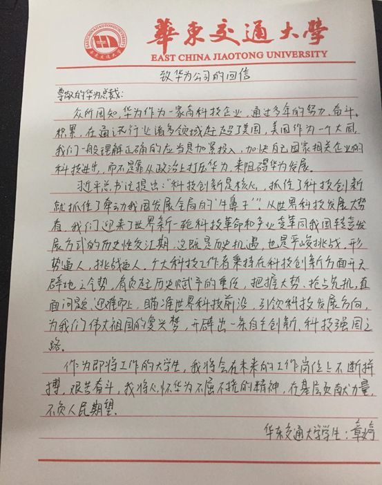 学习完信件并总结后,部分党员同志书写了对海思总裁致员工的信件的回信。回信内容深刻,阐明了作为大学生党员的先进性和危难关头临危不惧迎难而上的精神,作为当代大学生应该有的觉悟意识。