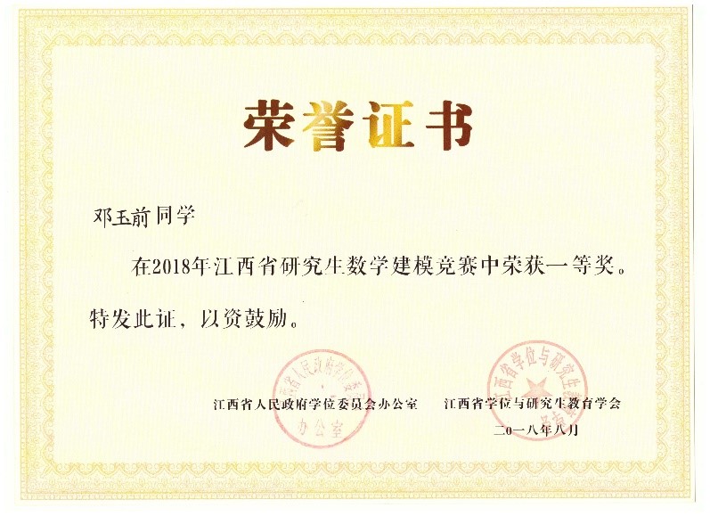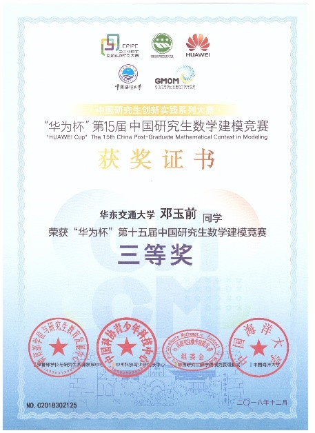 邓玉前,男,中共党员,2013级Williamhill威廉希尔电子信息工程2班班长,2015年6月加入中国共产党。他目前是2017级交通信息工程及控制研究生,也是电气学院研究生交通党支部组织委员。在校期间,他多次获得优秀学生干部荣誉称号并积极参加学校的各种比赛,曾经获得江西省电子设计大赛三等奖、国家励志奖学金、校三等奖学金、江西省智能车竞赛三等奖等。进入研究生阶段,他更加严格要求自己,不断学习,深刻认识到自己首先在学习上做好才能更好地为同学服务的道理,因此,在导师的指导与其自身的努力学习下,研究生期间他获得江西省数学建模一等奖,全国数学建模三等奖、发表学术论文CSCD一篇,在投SCI学术论文一篇,在电气研究生中起到良好的模范榜样作用与带头作用。
