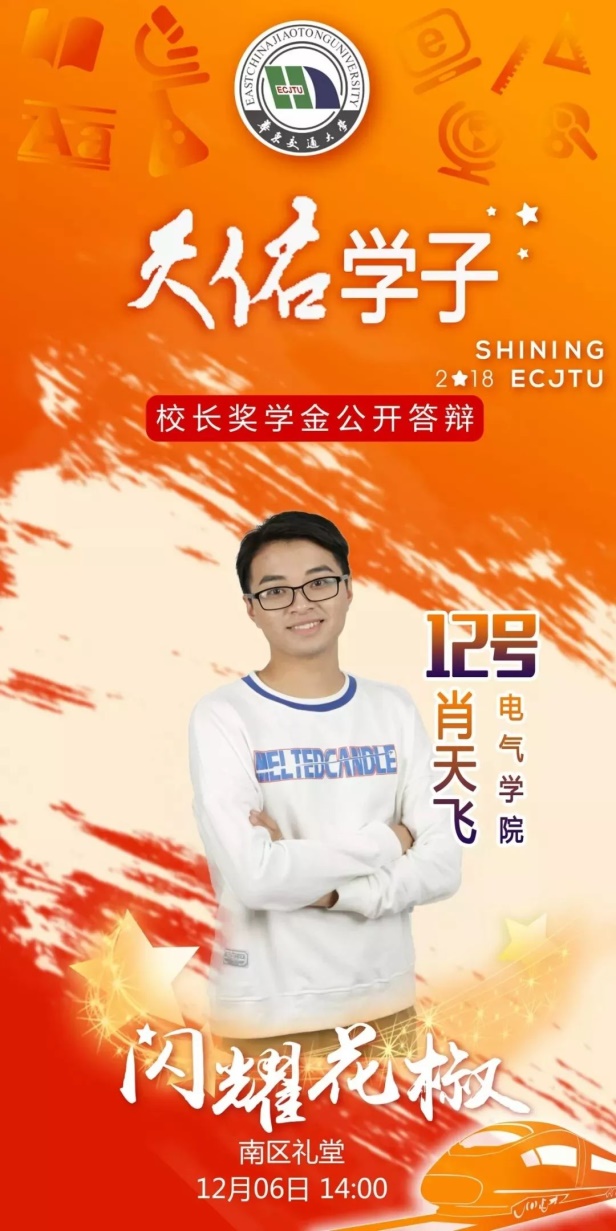 肖天飞,男,汉族,中共预备党员,Williamhill威廉希尔2016级电气学院电力系统专业学生。曾任天文爱好者协会会长,现任党教中心先锋队队长、2018级电气3、4班带班学生党员。他自强不息,乐观向上,助人为乐,成绩优异,给广大学生树立了良好的学习榜样。