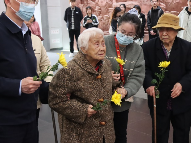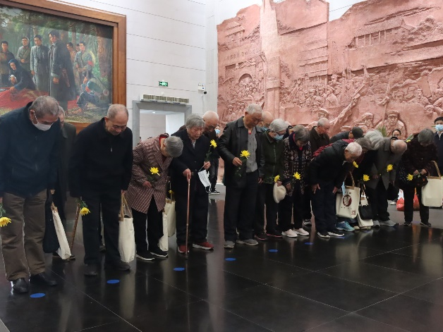 座谈后,在展厅序厅进行祭奠仪式。18位烈士后人从各地赶赴而来,尽管耄耋之年、步履蹒跚,也阻挡不住他们思念的脚步。他们为革命先烈敬献鲜花,鞠躬致敬。一朵朵金灿灿的菊花,捎去对逝去烈士的无限追思。