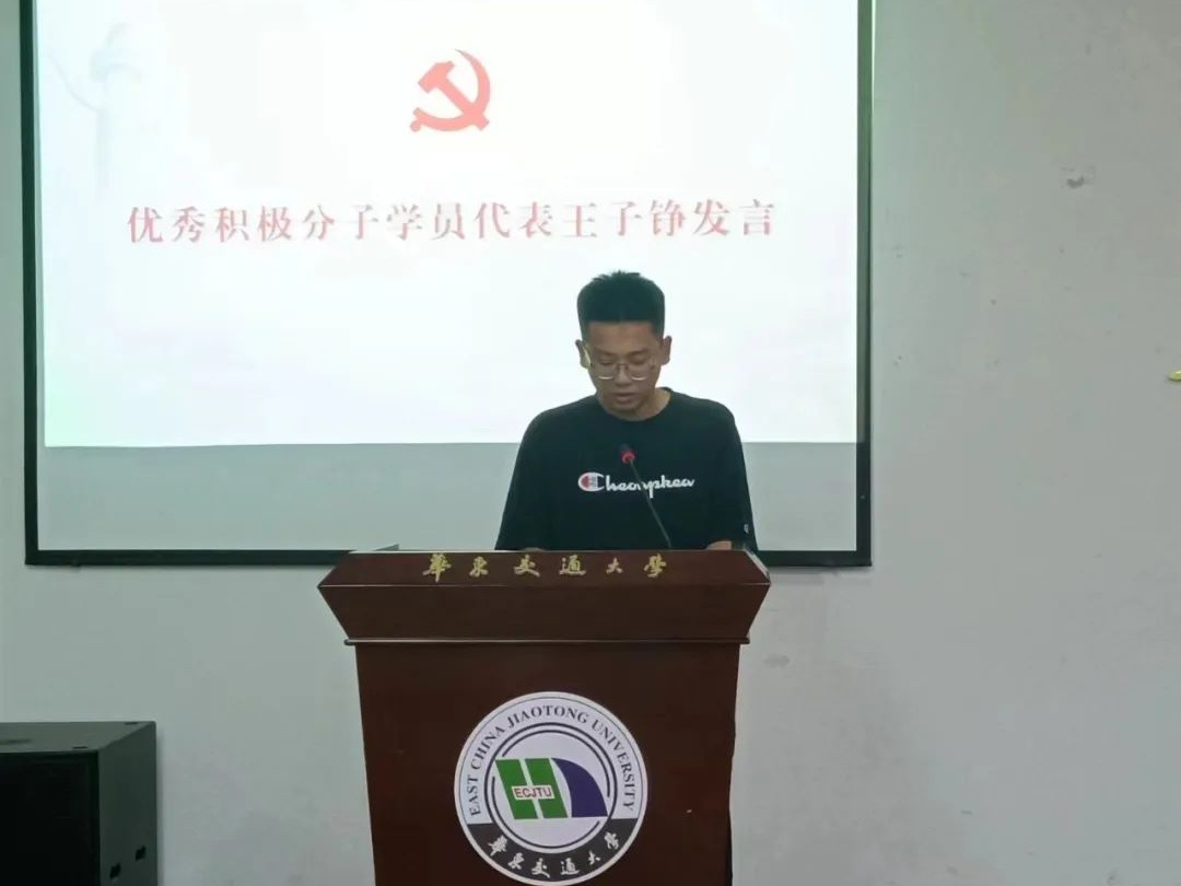 优秀积极分子学员代表王子铮发言。他代表全体入党积极分子表态,要坚持党员标准,绷紧一根弦,让政治理论学习成为一种习惯,认真学习习近平新时代中国特色社会主义思想,深入学习贯彻党的二十大精神,学思践悟共产党人在不懈奋斗中熔铸锻造的精神谱系。用党的奋斗历程和伟大成就鼓舞斗志,明确方向,用党的光荣传统和优良作风坚定信念,凝聚力量,用党的实践创造和历史经验启迪智慧,砥砺品格。把人生的小我真正融入国家发展,民族进步,人民幸福的大我之中。