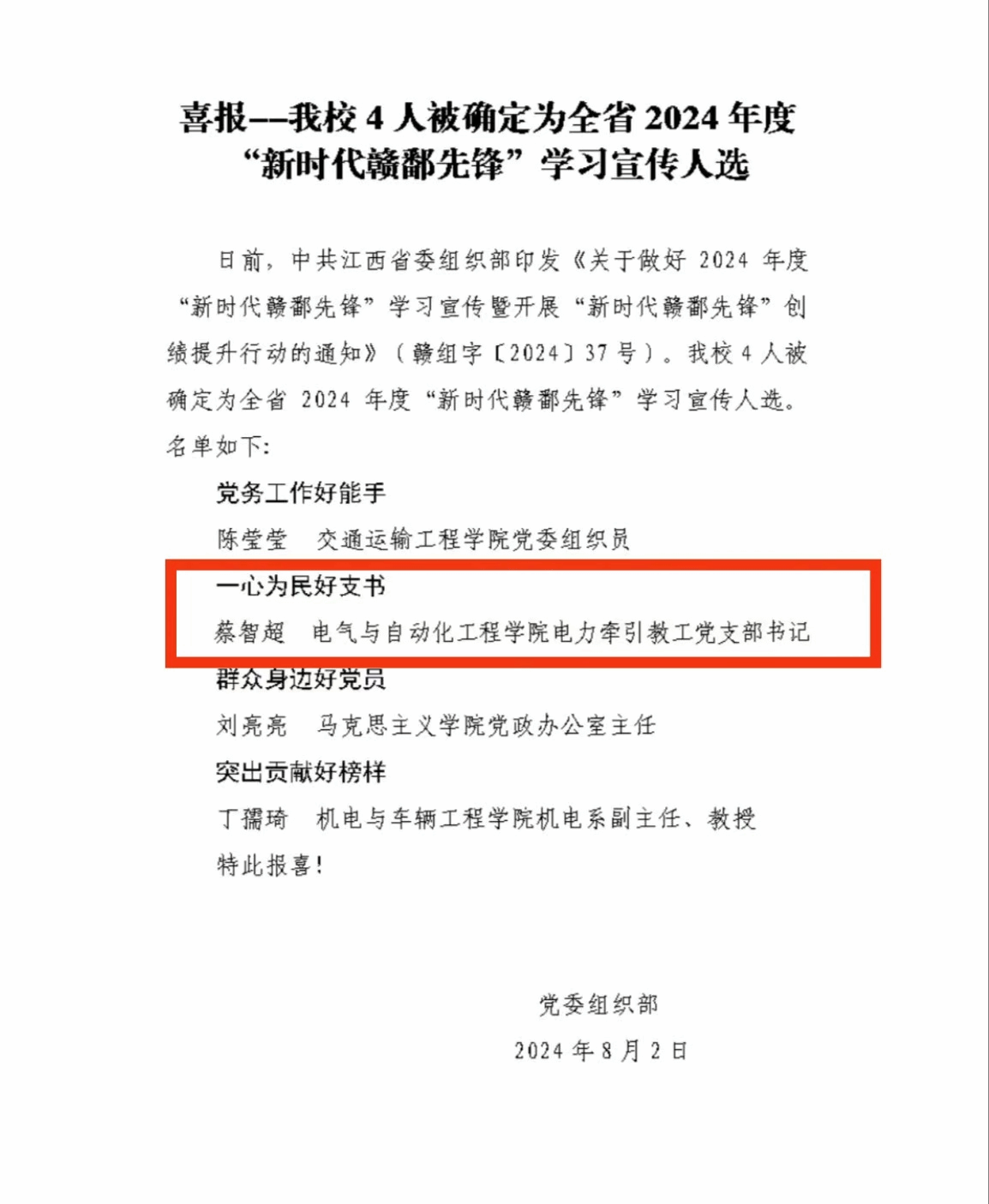 喜报 | 我院电力牵引教工党支部书记蔡智超被确定为全省2024年度“新时代赣鄱先锋”学习宣传人选