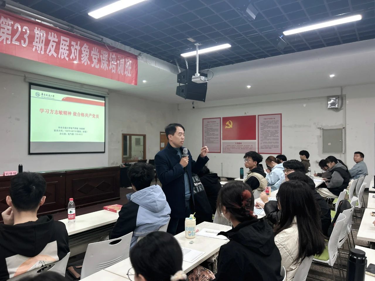 电气学院第四十八期入党积极分子开班典礼暨第二十三期发展对象党课培训在天佑会堂举行,电气学院院党委副书记、分党校副校长刘修财讲授党课第一讲——学习方志敏精神,做合格共产党员。
