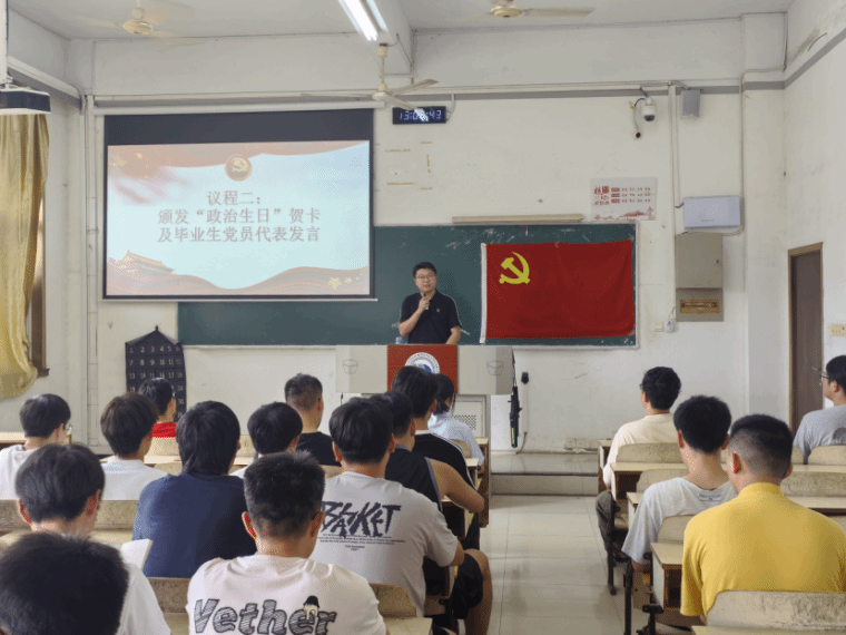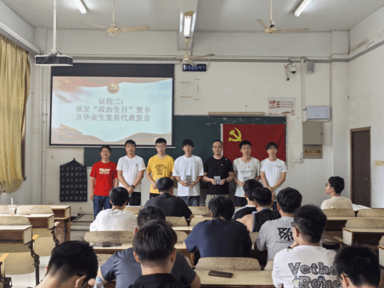 支部书记刘锋老师为毕业生党员过“政治生日”,颁发“政治生日”贺卡和纪念本,并合影留念。