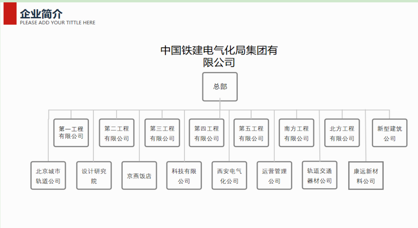 中国铁建电气化局集团有限公司,隶属于世界500强——中国铁建股份有限公司,2005年7月正式组建成立,总部设在北京,公司成员单位中有三家工程公司的前身为铁道兵第一、第二、第三直属通号营。公司是中国高铁“四电”行业唯一的系统集成承包商和运营服务商,主要从事高速铁路电气化、电力、通信、信号和城市轨道交通、公路交通、机电设备、输变电、新能源、智慧城市和信息技术等工程建设,是集科研开发、设计咨询、工程施工、运营维管、产品制造和商务开发为一体的“四电”工程承包商和系统集成商,更是集铁路“四电”投资商与服务商于一体的全生命周期产业运营商。公司拥有承包境外工程、设备材料出口和对外派遣劳务等经营权。