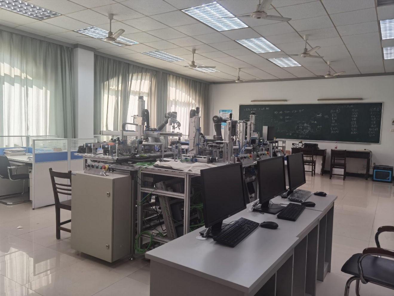 智能机器人协同控制实验室主要承担自动化专业的课程设计、毕业设计、学科竞赛、科学研究工作,现有实验室面积总共95平方米。 主要仪器设备有: 1、西门子PLC控制系统 2、计算机 3、网管型交换机 4、RFID无线射频系统 5、无线路由器 6、无线通讯系统 7、信息安全模块 8、科研设备变频器 9、工业机器人本体 10、供料站装置 11、加工站装置 12、装配站装置 13、物流及仓储站装置 14、信息管理系统装置